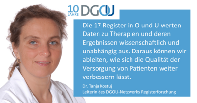 Warum die interdisziplinäre Zusammenarbeit der Register in O und U koordiniert werden muss und wie das funktioniert, erklärt Dr. Tanja Kostuj. Sie leitet das DGOU-Netzwerk Registerforschung, in dem sich Vertreter der einzelnen Register regelmäßig treffen und austauschen.