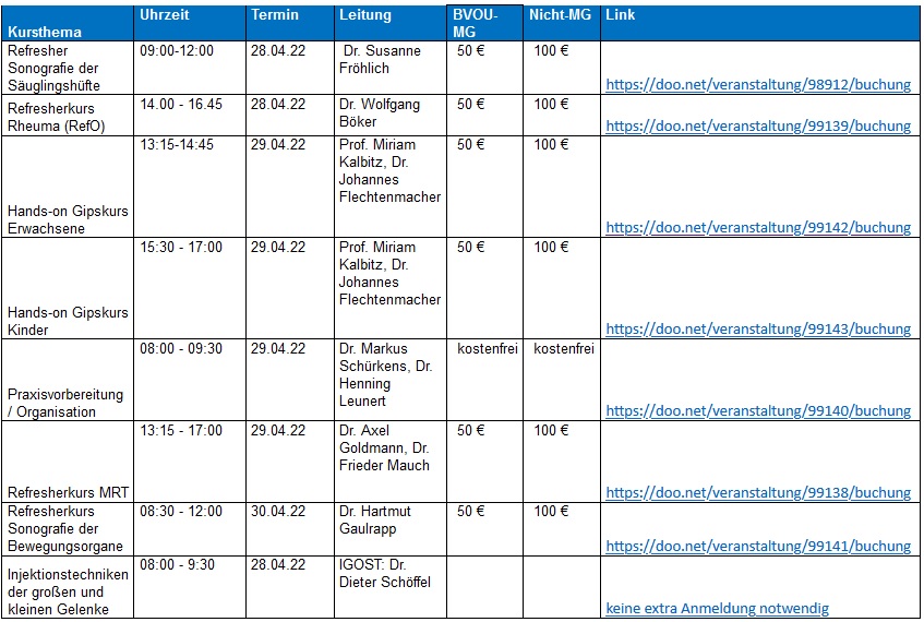 Das VSOU Organisationsteam hat neben einem anspruchsvollen und praxisrelevanten (sowohl operativ wie konservativ, Klinik wie auch Praxis) Hauptprogramm auch einige Kurse konzipiert um gerade für die „jüngeren“ Kolleg*innen am Übergang Assistent/Oberarzt/Praxis einige sinnvolle Kurse auf den Weg zu bringen.