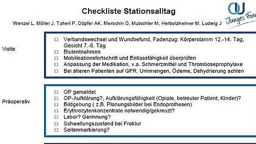 Das JuFo hat ein neues Hilfsmittel für den Berufsstart entworfen: Operationen, Sprechstunde und dazwischen die Stationsarbeit, schnell kann man da - vor allem in den ersten Jahren - den Überblick verlieren. Damit das nicht passiert, haben wir eine Checkliste für die Stationsarbeit erstellt. Damit können systematisch die wichtigsten Schritte abgearbeitet werden. Diese Checkliste ist natürlich nur ein Vorschlag, der in Absprache mit der Klinikleitung an die Verhältnisse und Vorgaben der eigenen Klinik und Stationen angepasst werden muss. Es wird kein Anspruch auf Vollständigkeit erhoben. Die Checkliste (PDF-Format) kann von der Homepage des JuFo heruntergeladen werden.