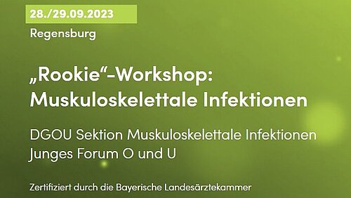 Der Workshop „Muskuloskelettale Infektionen“, der am 28. und 29. September 2023 in Regensburg stattfindet, richtet sich an Ärztinnen und Ärzte in Weiterbildung sowie an junge Fachärztinnen und Fachärzte. Der Workshop hat zum Ziel, Prinzipien der Diagnostik und Therapie von periprothetischen und frakturassoziierten Infektionen für den alltäglichen klinischen Einsatz zu vermitteln. Er wird in Zusammenarbeit der DGOU-Sektion Muskuloskelettale Infektionen und dem Jungen Forum O und U veranstaltet. Das Programm beinhaltet sowohl klassische Präsentationen als auch Falldiskussionen und räumt offenen Diskussionen viel Freiraum ein. Des Weiteren soll ein Workshop mit den beiden Programmpunkten „Gelenkpunktion“ und „Herstellung eines Antibiotika Spacers“ praktische Fähigkeiten vermitteln. Der