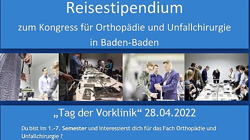 die Deutsche Gesellschaft für Orthopädie und Unfallchirurgie (DGOU) vergibt auch in diesem Jahr in Kooperation mit dem Berufsverband für Orthopädie und Unfallchirurgie (BVOU) 40 Reisestipendien für den "Tag der Vorklinik", welcher auf dem Kongress der „Vereinigung Süddeutscher Orthopäden und Unfallchirurgen“ (VSOU) am 28.4.2022 in Baden-Baden stattfinden wird.
