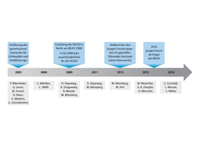 Es war im Rahmen der Jahrestagung der Shock Society in Phoenix (Arizona, USA) 2003, dass erstmals die Idee in den Köpfen der jungen Kolleginnen und Kollegen entstand, eine Interessenvertretung für junge Ärztinnen und Ärzte in Orthopädie und Unfallchirurgie zu gründen. Mit dieser erhoffte man sich, vor dem Hintergrund des strukturellen Wandels von Orthopädie und Unfallchirurgie hin zu einem gemeinsamen Fach, langfristig ein Mitspracherecht bei berufspolitischen Themen in den Fachgesellschaften. Durch Prof. Dr. Peter Biberthaler und Prof. Dr. Ulrich Liener wurde zunächst eine Arbeitsgruppierung der DGU ins Leben gerufen. Retrospektiv sei diese Gründerzeit in erster Linie durch Werben um Akzeptanz in der Fachgesellschaft geprägt gewesen, sagt Prof. Dr. G. Matthes. „Erstmalig wollten junge Ärzte Mitspracherecht in unserer Fachgesellschaft. Das war neu.“ Sechs Jahre später, im März 2009, wurde das „Junge Forum“ nach Annäherung an die DGOOC zu einer „ausschussähnlichen“ Arbeitsgemeinschaft der gemeinsamen Fachgesellschaft DGOU.