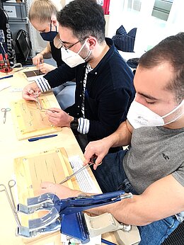 Thematisch war der Tag in drei Abschnitte gegliedert. Das themenbezogene Programm startete mit einem Vortrag von Dr. Alexander Zimmermann über die Grundlagen verschiedener Nahttechniken, wie Einzelknopfnaht, Subcutannähte, Vertikale U-Naht nach Donati und McMillan und Intracutannähte sowie Fadenkunde und die Besonderheiten variierender Wundverhältnisse. Das aufgenommene Wissen konnte im Anschluss von den Studierenden an Modellen geübt und so die feinmotorischen Fähigkeiten geschult werden. Gerade durch kleine Tricks im Handling und die Hilfe der Erfahreneren entstanden hierbei respektable Ergebnisse. Weiter ging es mit dem Themenkomplex der Thoraxdrainage. Hier wurde über die Indikationen, Techniken und Komplikationen der Thoraxdrainage diskutiert. Besonders greifbar wurde dieses Wissen durch einen Besuch auf der ITS in Begleitung von Dr. Maximilian Menger. Die Studierenden konnten bereits angelegte Thoraxdrainagen begutachten und gezielte Fragen stellen. Im Anschluss wurde das theoretische Wissen durch praktisches Üben vertieft und gefestigt. Als dritter Programmpunkt folgten die theoretische und praktische Vorstellung der Plattenosteosynthese sowie des Fixateur externe. Bevor die Studierenden jedoch selbst Hand anlegen konnten, musste den Kunstknochen eine Fraktur zugeführt werden. Wobei die Biegestabilität der Knochen einige Studierende überraschte. Besonders das Handling mit den OP Instrumenten, welche einige Studierende das erste Mal selbst in der Hand hielten, bildete ein Highlight des Tages und wurde mit voller Freude genutzt. Hierbei zeigte sich auch das handwerkliche Verständnis der Studierenden beim Anbringen von Platten, Zug- und winkelstabilen Schrauben. Am Ende gelang jedoch allen Studierende eine korrekte Reposition und Plattenosteosynthese der Fraktur.