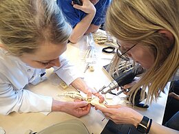 Die Studierenden konnten an drei Stationen klinische Fertigkeiten erlernen und einen Eindruck über die praktischen Tätigkeiten in O und U gewinnen. An der Sonografie-Station wurden die Grundlagen der Sprung- und Kniegelenksuntersuchung demonstriert und aneinander geübt. Weiterhin konnte die Marknagelversorgung einer Femurfraktur an einem Knochenmodell erprobt werden. An der dritten Station wurden verschiede Osteosynthesetechniken an der oberen Extremität durchgeführt. Neben der Versorgung von Phalanx- und Skaphoidfrakturen konnte auch eine Ulnaverkürzung am Modell geübt werden.
