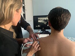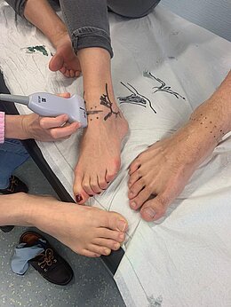 Der Fokus lag hierbei auf der Untersuchung des unteren Sprunggelenks und der Schulter. Dabei nutzten die Studierenden sich gegenseitig als Untersuchungsobjekte und lernten dabei die wichtigsten und auch im Klinikalltag verwendeten Schnitte im Ultraschall kennen. Begleitet wurde die Praxis von theoretischen Einheiten über DEGUM Richtlinien, Ultraschallhandling und Pathologien in den betroffenen Gelenken. Durch eine Kooperation mit der Notaufnahme konnte letzteres bei sich freundlicherweise zur Verfügung stellenden Patienten live gesehen und so auch erste Diagnosen gestellt werden.