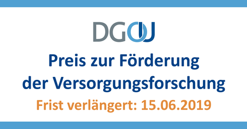 Bis zum 15. Juni 2019 haben Wissenschaftler noch die Gelegenheit, Ihre Arbeiten für den Preis zur Förderung der Versorgungsforschung einzureichen. Die Deutsche Gesellschaft für Orthopädie und Unfallchirurgie (DGOU) hat die Bewerbungsfrist verlängert. Mit der Auszeichnung würdigt die Fachgesellschaft herausragende wissenschaftliche Arbeiten zu diagnostischen, anwendungstechnischen oder klinischen Neuerungen auf diesem Gebiet. Der Preis ist mit insgesamt 5.000 Euro dotiert.