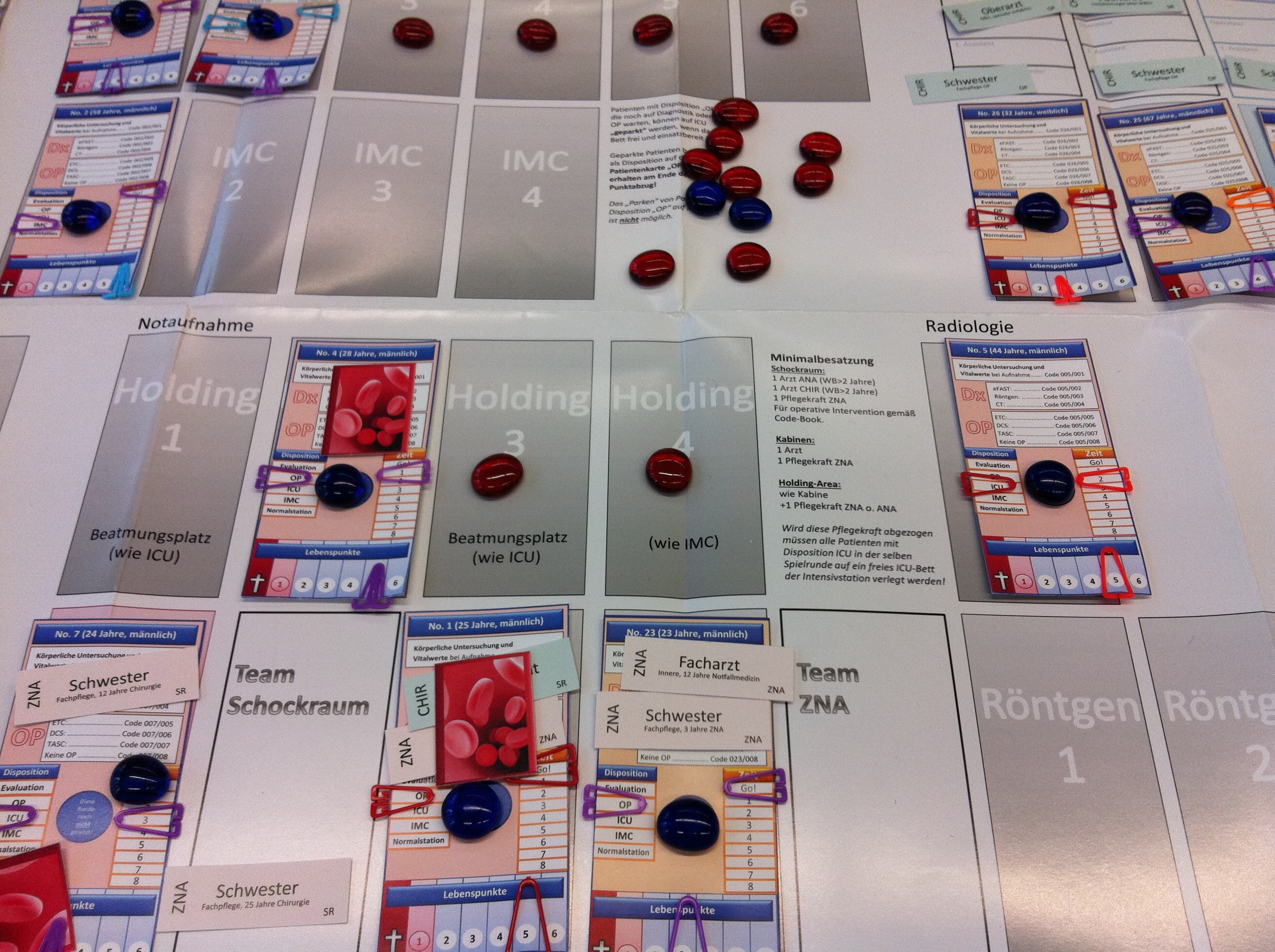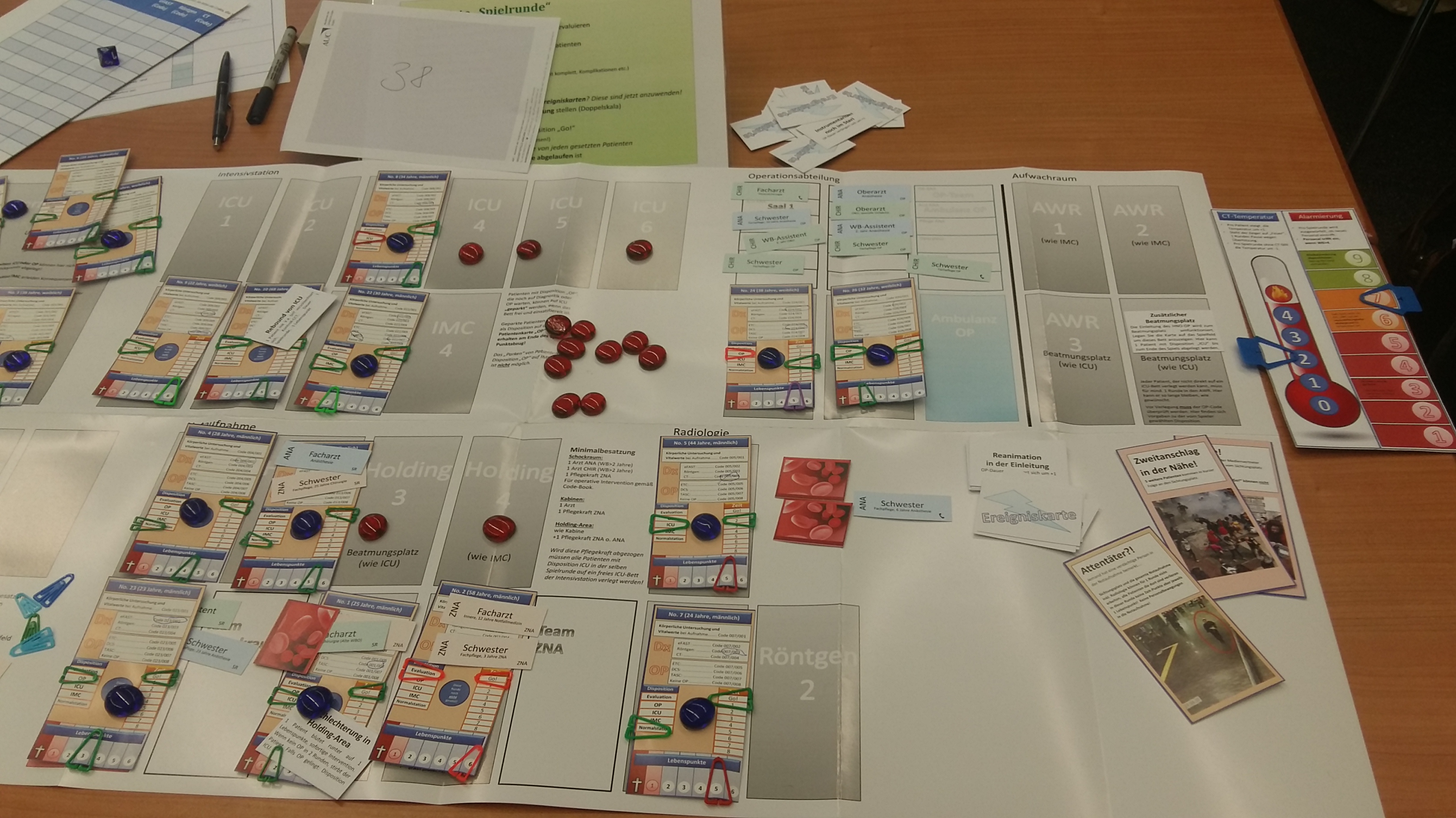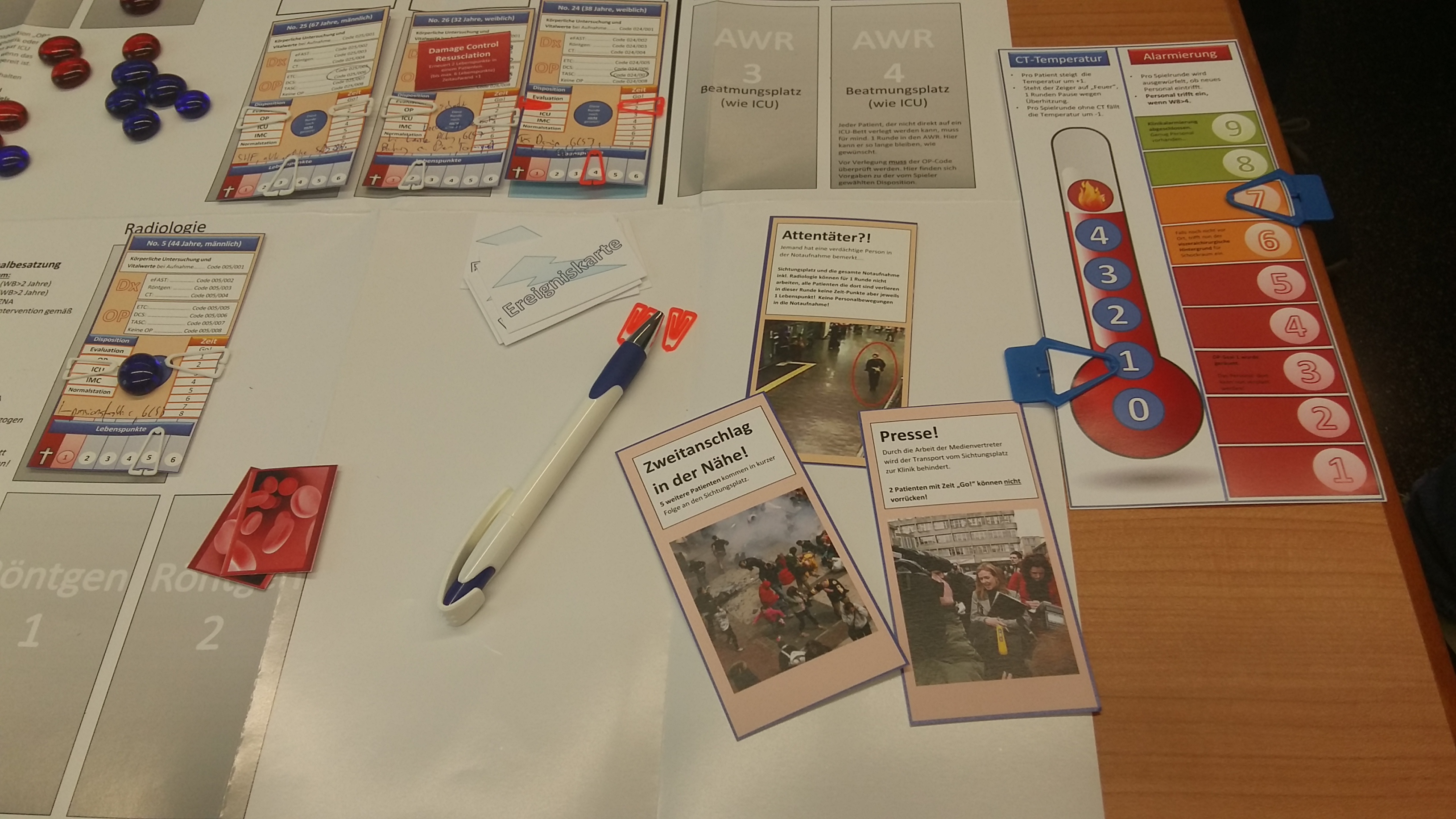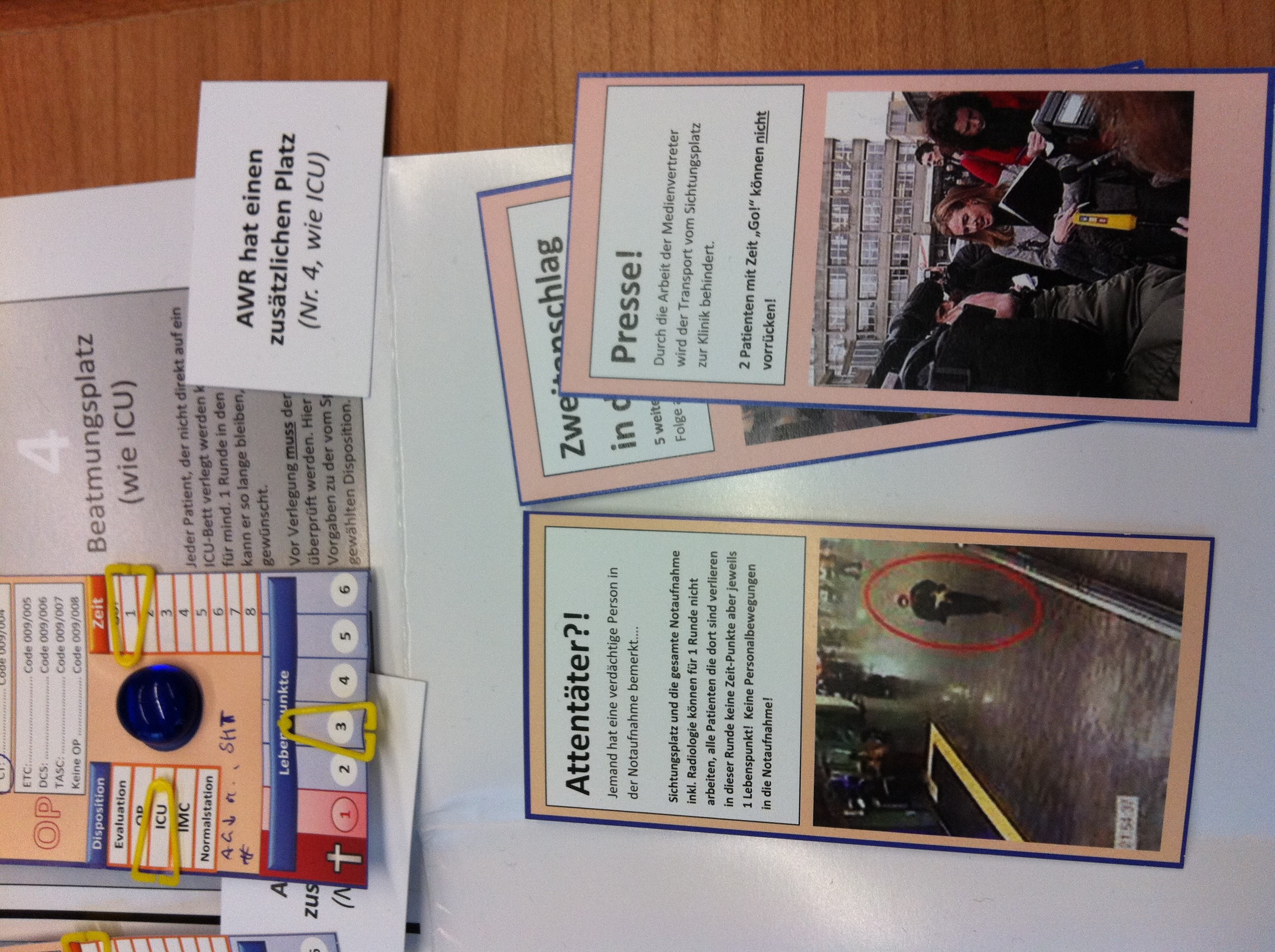 Das ist das Szenario, das die Teilnehmer im TDSC®-Kurs in der Simulationsübung trainieren: Eine Bombe explodiert in der Fußgängerzone der Innenstadt. Es gibt 120 Verletzte, 42 davon sind schwerverletzt und kommen mit stark blutenden Schuss- und Explosionsverletzungen in die Klinik der Kursteilnehmer. Dabei werden u.a. folgende Verletzungen simuliert: ein 25-Jähriger mit Einsprengungen am ganzen Körper, offenen Blutungen am Rumpf, einem Trommelfellriss und Verbrennungen; eine 36-jährige Frau mit einem abgerissenen Unterschenkel, versorgt mit einem Tourniquet; ein 24-jähriger Mann mit Bombensplittern im Gesicht und am Bauch, bei dem keine Atemgeräusche mehr feststellbar sind. Genau dieses Szenario wird anlässlich der 2. Notfallkonferenz von 12 Statisten bei der praktischen Sichtungsübung in der Klinik für Unfall-, Hand- und Wiederherstellungschirurgie der Frankfurter Uniklinik nachgestellt.