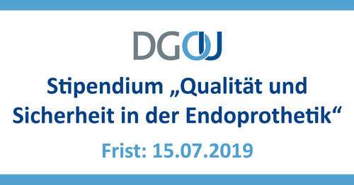 Mit dem Stipendium „Qualität und Sicherheit in der Endoprothetik“ ermöglicht es die Deutsche Gesellschaft für Orthopädie und Unfallchirurgie (DGOU) Nachwuchswissenschaftlern, besondere Leistungen auf dem Gebiet qualitätssichernder Maßnahmen in der endoprothetischen Versorgung zu erbringen. Die Auszeichnung ist mit 10.000 Euro verbunden. Bewerbungen können noch bis zum 15. Juli 2019 eingereicht werden.
