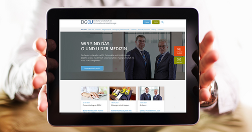 Bereits auf der Startseite ist der neue Look der Website nicht zu übersehen: Große Bilder und breite Kacheln lenken die Aufmerksamkeit auf die wichtigsten aktuellen Themen aus O und U, die DGOU- Kampagnen sowie auf die inhaltlichen Schwerpunkte der Fachgesellschaft.