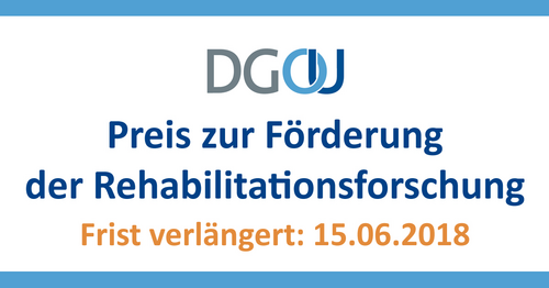 Die Bewerbungsfrist für den Preis zur Förderung der Rehabilitationsforschung ist bis zum 15. Juni 2018 verlängert. Mit der Auszeichnung würdigt die Deutsche Gesellschaft für Orthopädie und Unfallchirurgie (DGOU) eine herausragende wissenschaftliche Arbeit aus Klinik, Forschung oder Praxis, die sich mit dem Nutzen und Erfolg der Rehabilitation nach orthopädisch-unfallchirurgischen Verletzungen und Erkrankungen befasst. Der Preis ist mit 5.000 Euro dotiert.
