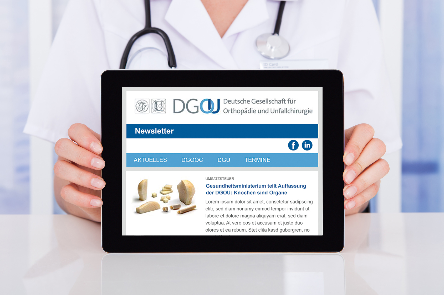 Der Newsletter der Deutschen Gesellschaft für Orthopädie und Unfallchirurgie (DGOU) informiert alle Mitglieder der Fachgesellschaft monatlich kurz und knapp zu aktuellen Themen und Terminen aus O und U. In den Rubriken „Aus der DGOOC“ und „Aus der DGU“ werden zudem Neuigkeiten und Projekte der Muttergesellschaften vorgestellt.