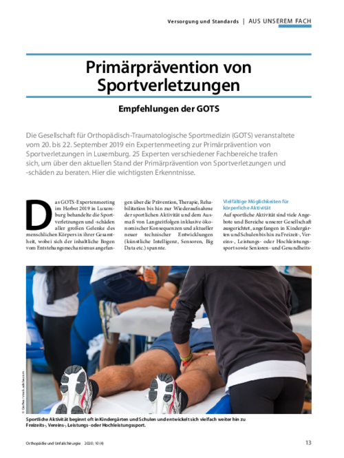 Um zu sensibiliseren und dem Verletzungsanstieg nach Möglichkeit entgegen zu wirken, hat die GOTS einen Katalog mit primärpräventiven Methoden und Anreizen für Sportler erstellt. Studien haben bereits ergeben, dass schon „mit relativ wenigen Mitteln bis zu 50 Prozent der Verletzungen verhindert werden können“, sagt Tischer. Wenn man sich an die mögliche Halbierung der Fallzahlen auch nur sukzessive annähern könnte, wäre jedenfalls schon viel gewonnen. Welche genauen gesundheitssichernden Ansätze von der Expertenrunde erarbeitet worden sind, ist jetzt im OUMN-Artikel „Primärprävention von Sportverletzungen – Empfehlungen der GOTS“ (© DGOU und BVOU [2020] Published by Springer Medizin Verlag Berlin [2020]. All rights reserved.) nachzulesen.