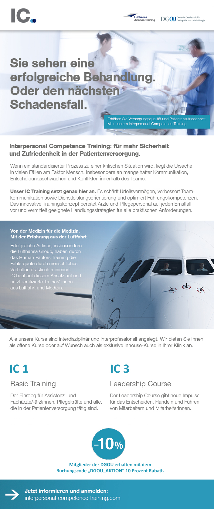 Die Kursreihe „Interpersonal Competence Training“ gibt Ärzten und Pflegenden Werkzeuge an die Hand, um die Arbeit im Team und die Sicherheit in der Patientenversorgung nachhaltig zu verbessern. Das innovative Kurskonzept wurde von Lufthansa Aviation Training (LAT) in Kooperation und mit der Expertise der Deutschen Gesellschaft für Orthopädie und Unfallchirurgie (DGOU) entwickelt. Der nächste Kurs für Assistenz- und Fachärzte (IC 1) findet vom 13. bis zum 14. Dezember 2019 in Seeheim-Jugenheim statt. Mitglieder von DGOU, DGOOC und DGU erhalten 10 Prozent Rabatt mit dem Buchungscode „DGOU_AKTION“.