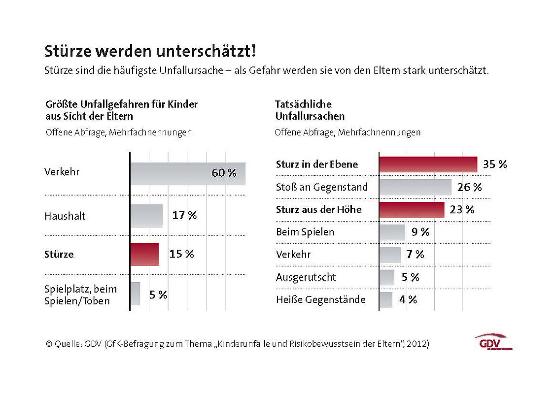 Kleine Kinder stolpern beispielsweise oft über eine Teppichkante und schlagen mit dem Kopf auf einem Couchtisch auf, Ältere fallen im Tiefschlaf oder beim Spielen vom Hochbett oder stürzen aus aus dem Fenster – Gefahren, die häufig verkannt werden. Nur 15 Prozent der befragten Eltern halten Stürze für die größte Unfallgefahr.