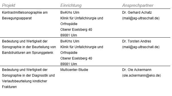 Folgende wissenschaftliche Projekte werden aktuell unter der dem Dach bzw. in Kooperation mit der AG Ultraschall der DGU bearbeitet: