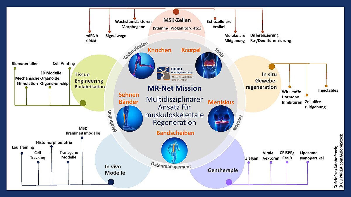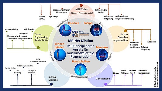 Für die Erforschung der muskuloskelettalen Regeneration ist ein multidisziplinärer Ansatz nötig, welcher in den Forschungslaboren der Kliniken für Orthopädie und Unfallchirurgie umgesetzt wird. Dieses Forschungsfeld beschäftigt sich mit der Regeneration des betroffenen Muskuloskelettalgewebes außerhalb oder innerhalb des menschlichen Körpers. In den Forschungsprojekten werden physiologische und pathologische Prozesse und Erkrankungen des muskuloskelettalen System untersucht, die Biologie von Stamm- und Progenitorzellen und deren molekularen und zellulären Signalwegen erforscht, die Mechanismen der Regeneration sowie die Entwicklung von biomaterial- und zellbasierten Therapieansätzen für muskuloskelettalen Gewebeläsionen aufgeklärt. In enger Zusammenarbeit mit der klinischen Forschung wird an der Regeneration von Verletzungen und Erkrankungen des muskuloskelettalen Systems (restitutio ad integrum) sowie an der Abnutzung (Degeneration) und Funktionseinschränkung geforscht. Die Translation neuer Therapieverfahren aus experimenteller Forschung und präklinischen Studien wird verfolgt. Durch die Vernetzung der Forscher strebt das MR-Net eine Strukturierung und Bündelung der experimentellen und klinischen Forschung zu muskuloskelettalen Erkrankungen an, um, möglichst perspektivisch, neueste Ergebnisse in die klinische Versorgung umzusetzen und so die Lebensqualität und Mobilität der Patienten zu unterstützen.