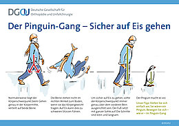 Der Pinguin macht es vor: Beim Pinguin-Gang wird der Körperschwerpunkt über dem vorderen, also dem auftretenden Bein ausgerichtet – der Fuß setzt jeweils mit ganzer Sohle auf und zeigt leicht nach außen. Das belastete Bein steht damit im rechten Winkel zum Boden. Die leicht nach vorn geneigte Körperhaltung sorgt so für mehr Stabilität. Damit sinkt die Gefahr, auf spiegelglattem Untergrund das Gleichgewicht zu verlieren und zu stürzen.