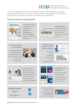 Mitglieder der DGOU gestalten ihre Zukunft und die des Faches Orthopädie und Unfallchirurgie mit. Sie sind eingeladen, sich aktiv in unseren Sektionen, Arbeitsgemeinschaften und Ausschüssen einzubringen und zu netzwerken, um die Themen unseres Faches weiter voranzubringen. Das sind die Vorteile einer DGOU-Mitgliedschaft.
